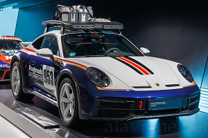 Sprinkled in amongst the various series models were famous racecars of the 70s and 80s - the so-called "pink pig" Porsche 917 from early 1970s Le Mans, painted up to look like a diagram of cuts of meat; the 956 racecar of the eighties, mounted upside-down on a ceiling section to symbolize its use of super-high downforce; and a beat-up time-tested example of the off-road racer 911 Dakar - in full classic blue-white Rothman's livery - which was basically an off-road variant of the mighty 959 supercar.