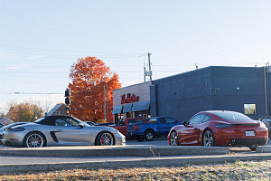 With the cars freshly-sprayed, we returned to our motel, where soon enough, a white Cayman T burbled down into the parking lot. This was user @worf, the first of our three American drivers. After a quick but warm greeting, he headed off to check himself in. Separately, I had established contact with user @GT40Guy, who had completed his drive into North Conway and was staying at a nearby motel. After a bit of back-and-forth, we all collectively settled on a restaurant, and headed off to dine there, where we would get to properly meet and get to know each other.