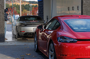 @BGTS2025 and I had booked lodging at the Swiss Chalets Village Inn in North Conway. They were done in a reasonably-convincing swiss-chalet style, and that extended to the tidyness and cleanliness of the rooms. Once settled in, @BGTS2025 and I headed to the nearest self-operated spray-wash to get rid of the day's rain grime. The GTS 4.0s were going to be doing some socializing tonight., and one usually takes a shower before going out and meeting others, right?
