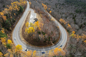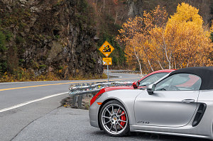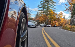This lower part of the Kancamagus Highway was super beautiful today.   The forest is mostly deciduous through here, and although the leaves were past peak-color, they were still mostly on the trees - although now almost uniformly a reddish-brown russet color.  Combined with a warm morning sun and the perfectly-paved gentle curves of the road, we captured some great views of our little Porsche Procession.