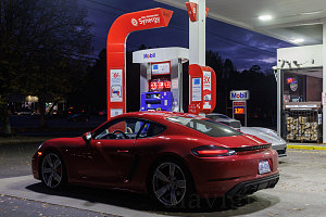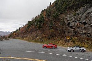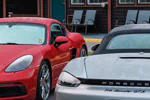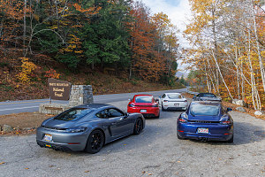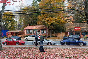 Sportscars always draw interest, especially for other enthusiasts, and even our comparatively small 5-car Porsche group had drawn out some of the other group to check us out.   We learned that they were a group of drivers from New York City, out for a long-planned four-day driving excursion.   Soon we were chatting, sharing info and notes, and a photographer with a framed gimbal setup was taking panning shots of our nicely-lined up cars.