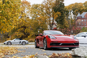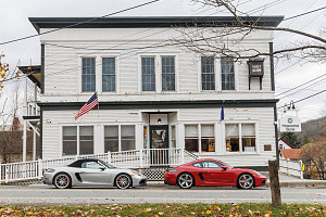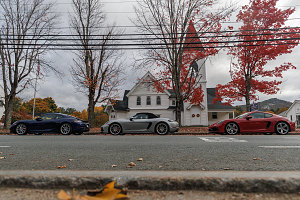 We lined up in front of Peach's Restaurant in North Conway shortly before 8am.   Being a Monday morning, the main drag in North Conway was bustling with commuter traffic, but fortunately, the linear parking spots across from the restaurant were all empty, allowing us to line up our 718s nose-to-tail.   It was nice seeing all of the model and color variants next to each other.