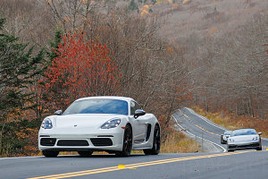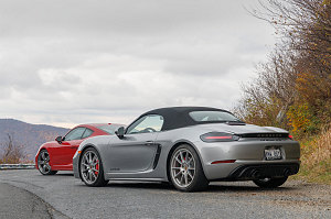 @BGTS2025's GT Silver Boxster GTS soon arrived, and we set up the cars for some nice hero shots, climbing up the steep rocky sides of the Gap to get good photo angles.   We could see that the road was distinctly damp as it began its westward descent.   It was apparent that the moisture was getting squeezed out of the clouds on the westward slopes, developing into a thin drizzle that kept everything on that side cool and wet.   Inversely, on the eastern side, the side we had just come up, a rain shadow effect had kept things dry.   Nice and grippy and dry!