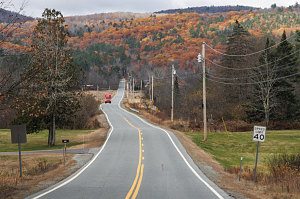 Generally speaking, the main mountain ranges of the Green Mountains in Central Vermont run north-south, and present high, semi-continuous barriers to east-west travel.  Sure enough, our westward progression was halted by the long north-south ridgeline of the Northfield Mountains, and the valley and our highway bent almost due north.  That was ok, because one of my goals for the day was to sample what I knew to be a very twisty mountain pass route, and that route was a little ways to our north.