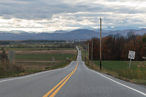 The curves faded away as we transitioned from mountain descent to undulating farmlands.   The clouds also faded away, as did the drizzle and dampness, further confirming the nature of the effect that had wetted out the western side of the Appalachian Gap twisties.   Ahead in the far western distance, we could see the silhouettes of the Adirondack Mountains of New York state, now only a few tens of miles away.