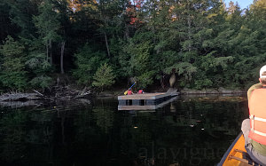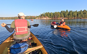 Our paddle was most enjoyable. With room-temperature air and no wind, our canoes glided easily through the water. Those of us in canoes were clearly faster than the stubbier, wider packrafts. We could see Chris and Gillian straining and splashing a bit harder than we were.