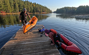 With Bell Lake Road being easy to traverse, we arrived at the Bell Lake access parking lot about 20 minutes before the outfitters' opening time, and we used that to prep our gear and our packs. We were also waiting for the final two members of our journey today - Chris and Gillian Hatko, who had chosen to spend the previous night in a Sudbury Motel. They were also en-route to this same parking lot. And soon enough, there they were. With them were two inflatable packrafts - packrafts that they had made themselves from scratch. They would be using them for the paddling portion of our journey to Silver Peak.