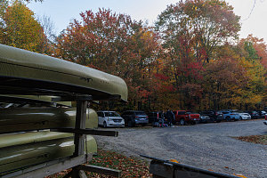 Disembarcation was easy with such a good dock, and soon, we were hauling our gear up into the trees, where another nice amenity awaited us - multiple sets of modern canoe racks. Clearly this route is set up to handle a lot of volume. Fortunately, today the racks were mostly empty, and there was plenty of space for our canoes and gear.