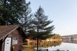 Even though it was 8am, there was no one about. The door to the main building was locked. A smaller building near a dock on the shore had signs on it, which read: "Welcome to Blue Mountain Lodge. For Service, Turn On Lights and Blow Horn. Killarney Kanoes."