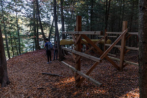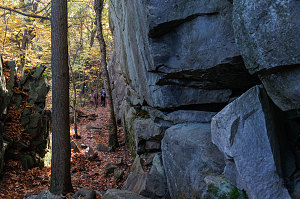 Almost immediately, the trail started to angle uphill. It was still smooth and easy, but soon that changed. The trail in places crossed over sections of loose, angular rocks. The trail made a large, lazy hairpin to the east and began a traversing rise up a low-angled maple-forested slope. It then zig-zagged back and forth a couple more times before levelling out and following along the base of a dark, high cliff. I could see from my GPS map that the trail was not heading directly for the summit, but rather angling up to the southeast, following the general grain of the terrain.
