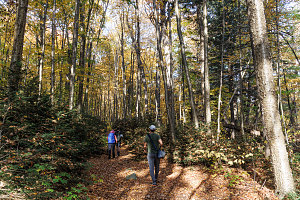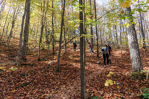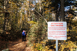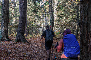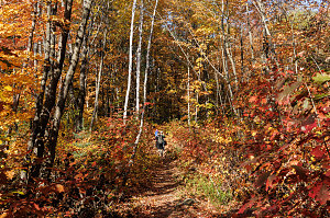 The trail curved here and there but generally maintained a fairly direct heading westward. It was smooth, free of roots and rocks, and offered very easy walking. Being in October in a location fairly far north, we had worried that we may have missed the peak of the fall foliage season. But, as we walked, it seemed pretty much in full force. Although it was clearly not a max-vibrancy, max-saturation sort of fall season, the forest was still filled with all sorts of reds, oranges, yellows and russetts. And even though we were nearly mid-October, there were several occasions where groves of trees were still largely green.