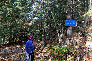 Immediately beyond the racks, a large blue sign indicated the direction and distance to Silver Peak: 5.6km. Beyond the sign, a leaf-strewn trail led off to the west. Time to start the land portion of our Silver Peak quest.