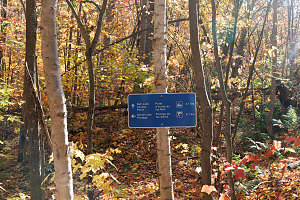 As mentioned, we passed several junctions as we hiked west. Some were trails to portage access points. There was a junction with the main La Cloche-Silhouette backpacking loop, which led left, in the clockwise direction. We did not want to go that way and maintained our westward course, now briefly on the loop.