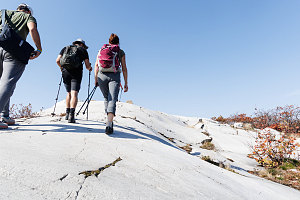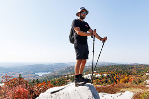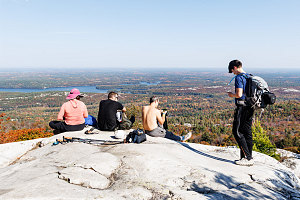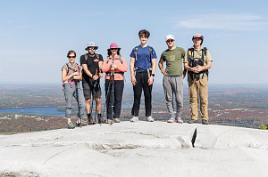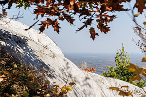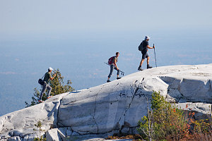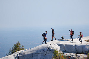 Before heading down, we wanted to check out one final spot - the open terrain on the top of the Eastern subsummit, which we could see maybe 75 metres away from us, separated by a shallow depression filled with small oak trees. I got the rest of the group to head over without me, directing them to climb the open rib of quartzite so I could remain on the main summit and get some nice zoomed-in hiker-against-landscape shots.