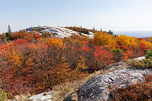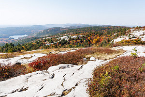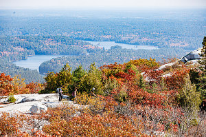 Because Silver Peak is positioned at the eastern end of the La Cloche range and our viewpoint was to the north, we didn't see other mountains or mountainous terrain from here: instead, the mountain dropped away steeply to the beginning of flat wilderness that stretched away to north until the terrain faded into the warm haze. In the near distance, many lakes could be seen, the largest of which was David Lake - one of the park's largest inland bodies of water and home to many backcountry campsites. Everywhere was a patchwork of fall colors. It was an amazing, wonderful view.