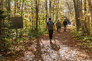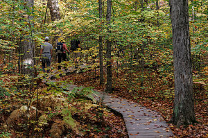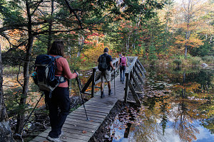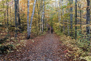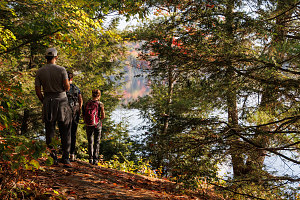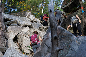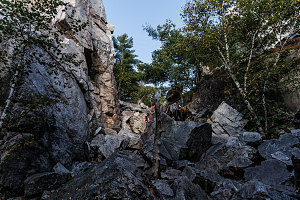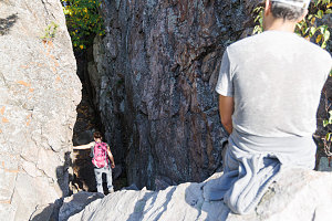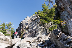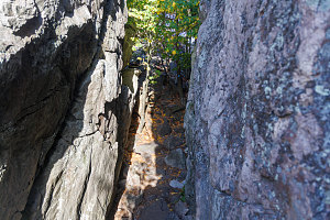 The Crack is a craggy gap in Killarney Ridge, itself a part of the South La Cloche Mountain range. To reach it, you start off from a parking area immediately adjacent to route 637, not far west of the George Lake Campground. The hike is a there-and-back, and is about 3.85km each way. Because of its beauty, uniqueness, easy access and short distance, this trail gets a lot of visitation. In fact, the parking lot almost always overflows on in-season weekends, and the park has instituted a permit system. To get one, you must register at the park office at George Lake, up to five days in advance. If you are also a camper at the campground (as we were), the permit is no additional cost.