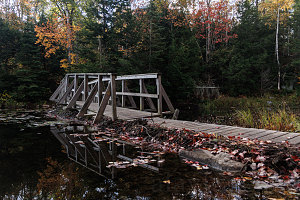 Twenty-ish minutes of very easy, slightly downhill hiking brought us to a bridge crossing of Kakakise Lake. The bridge was slightly tilted, owing to a decision by beavers to use it as the scaffolding for a full-on beaver dam; they had plastered mud and sticks underneath the bridge, and on one end this had been done to such an extent that the bridge was slightly warped upwards.