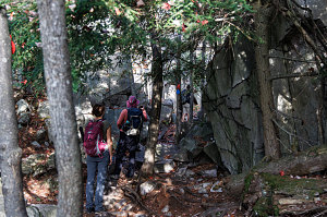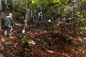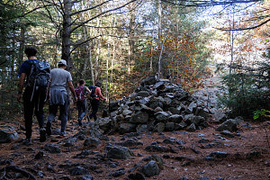 We had started this hike early because we had heard that rain was in the forecast for the afternoon. However, scanning the sky to the west of us revealed no hint of any incoming weather - just clear skies and gentle puffs of clouds. In any case, we had decided to head back to Ottawa today, and to avoid arriving too late, we wanted to finish the hike no later than noon, so that we could do the bulk of our drive back in the afternoon. And so, after getting our fill of snacks and of the scenery, we started our descent back to the trailhead.