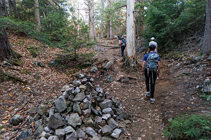Partway along the western shore of Kakakise Lake, the trail finally started to make its ascent. At first we were on soft slopes (a recent re-route, actually) in open pine forest, but after curving up and around, we started to encounter rougher trail. For some reason, the park had constructed especially massive cairns through here, although the trail seemed obvious. We started coming to small, sharp outcrops of white quartzite bedrock, sometimes requiring a move or two of easy scrambling.