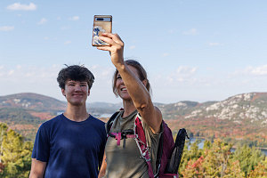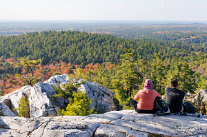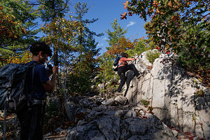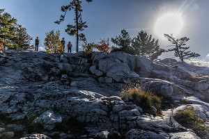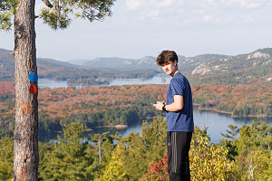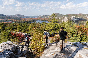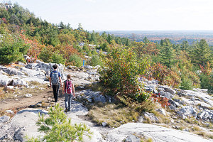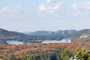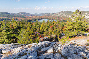 Spread out before us was an amazing vista towards the main line of the La Cloche South Range, with Blue Ridge on the right and Killarney Ridge on the left. Nestled in the middle of these two ridgelines were a chain of lakes, many dotted with tiny islands. Outcrops of white quartzite peppered the rounded hills, which continued off into the distance until they disappeared into the haze. Brilliant splashes of fall foliage covered the land between the lakes. Off to the left, now much closer and more visible than on Silver Peak, was the dark blue line of Georgian Bay and Lake Huron. This had to be one of the best views in the park. No wonder it was such a busy destination.