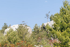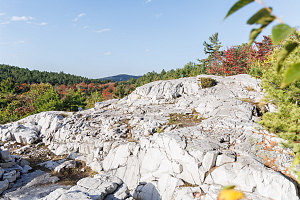 The bits of crag soon gave way to extensive areas of open bedrock. The trail through here was marked with blue dots affixed to wooden posts. The rock here was indeed the same bright white quartzite as on Silver Peak. But unlike Silver Peak, it was not smooth and rounded, but rather craggy and fractured.