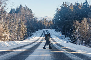 Despite the molasses clutch, the trusty CR-V delivered us safe and sound to the Ampersand Trailhead along Route 3 at around 8:30 a.m. Fortunately, there was a bright patch of sun in which to park, which let us get some direct heat on us as we frittered about, getting our packs and gear ready.