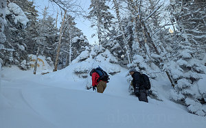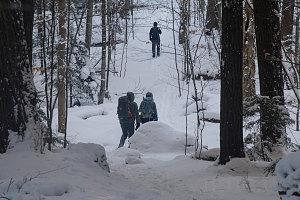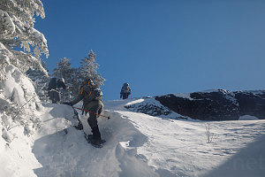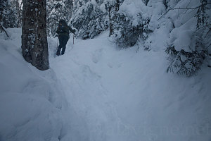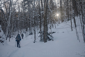The going was easy. The snowpack wasn't all that deep initially, and although a party ahead of us had broken out the trail without snowshoes (unfortunately), the postholing was minimal, and the four of us stamped out a nice track over the footprints. As is typical on snowshoe outings (especially ones as cold as this), we required a few quick stops to readjust bindings and straps.