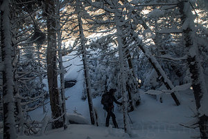 Despite the benign appearance (clear, sun and relative calm), the bitterly cold temperatures made the summit area rather inhospitable, especially when a slight breeze came through. We therefore did not linger for long, soon turning around and making our descent back to a little balcony area at treeline. Here I showed the others the detritus from my snowshoe failure. Given that I would be walking down sans-snowshoes, we agreed that I'd position myself at the back of the group, in order to let the others further pack down the trail in order to minimize my chances of post-holing.