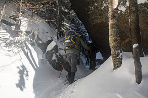 Shortly before 11 a.m. we arrived at that magical spot on the crest of Ampersand, where in winter there is typically a snow-coated wonderland, bounded on the left by a crag of the mountain that shoots up into the sky. Today, with the clear and strong sun, light reflected off the cliff of that crag and down into the shady little spot on the crest. From here, we knew, the going was easy. A bit of crest walking and then a final steep climb up into the open and to the 360-degree views on the summit.