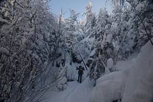 The descent was fairly uneventful. Partway down, I felt bad about leaving even small divots in the trail, and had Gino go behind me to smooth those over. I had gotten pretty good at avoiding post-holing, and mastering the half-slide half-step that worked best down the very steep bits of the trail. My toes seemed to have survived the worst of it, because I could feel a weird blocky sensation slowly creep across each toe, which I knew was them starting to thaw out. I think I can safely say that -26C or -27C is about the coldest these particular mountaineering boots can handle for my particular feet.