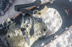 At a spot where the trail wound down and around some bouldery obstacles, the straps on one of my snowshoe's bindings popped off. It wasn't the first time this had happened; the extremely cold weather was making it hard to bend the rubbery straps around and onto the holding tabs. They often popped back off with the motion of walking.