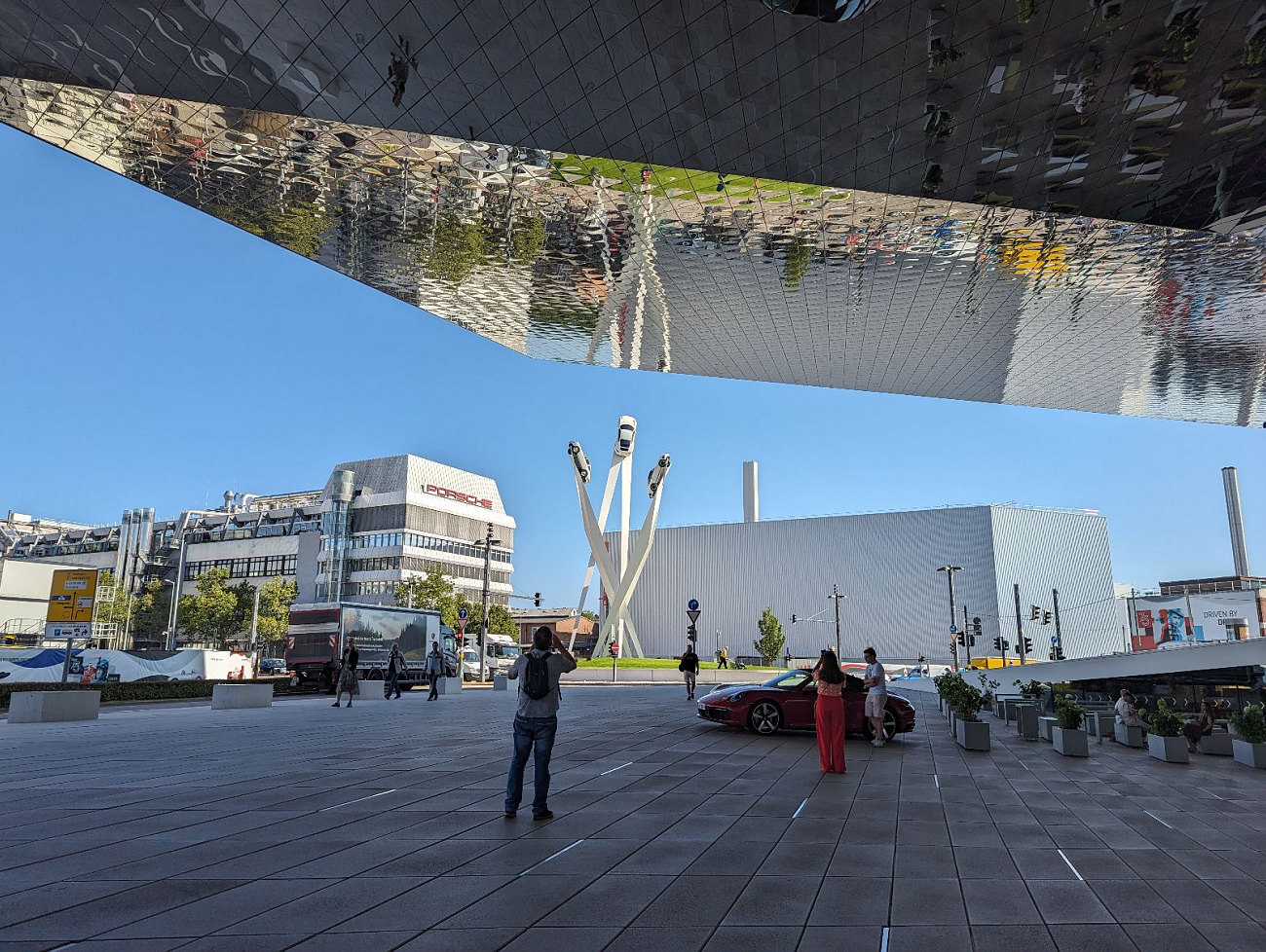 From the Museum Overhang The view from the mirrored overhang of the entrance to the angular Porsche Museum building, in Zuffenhausen. Porscheplatz and one of the 911/718 Factory buildings are visible beyond.