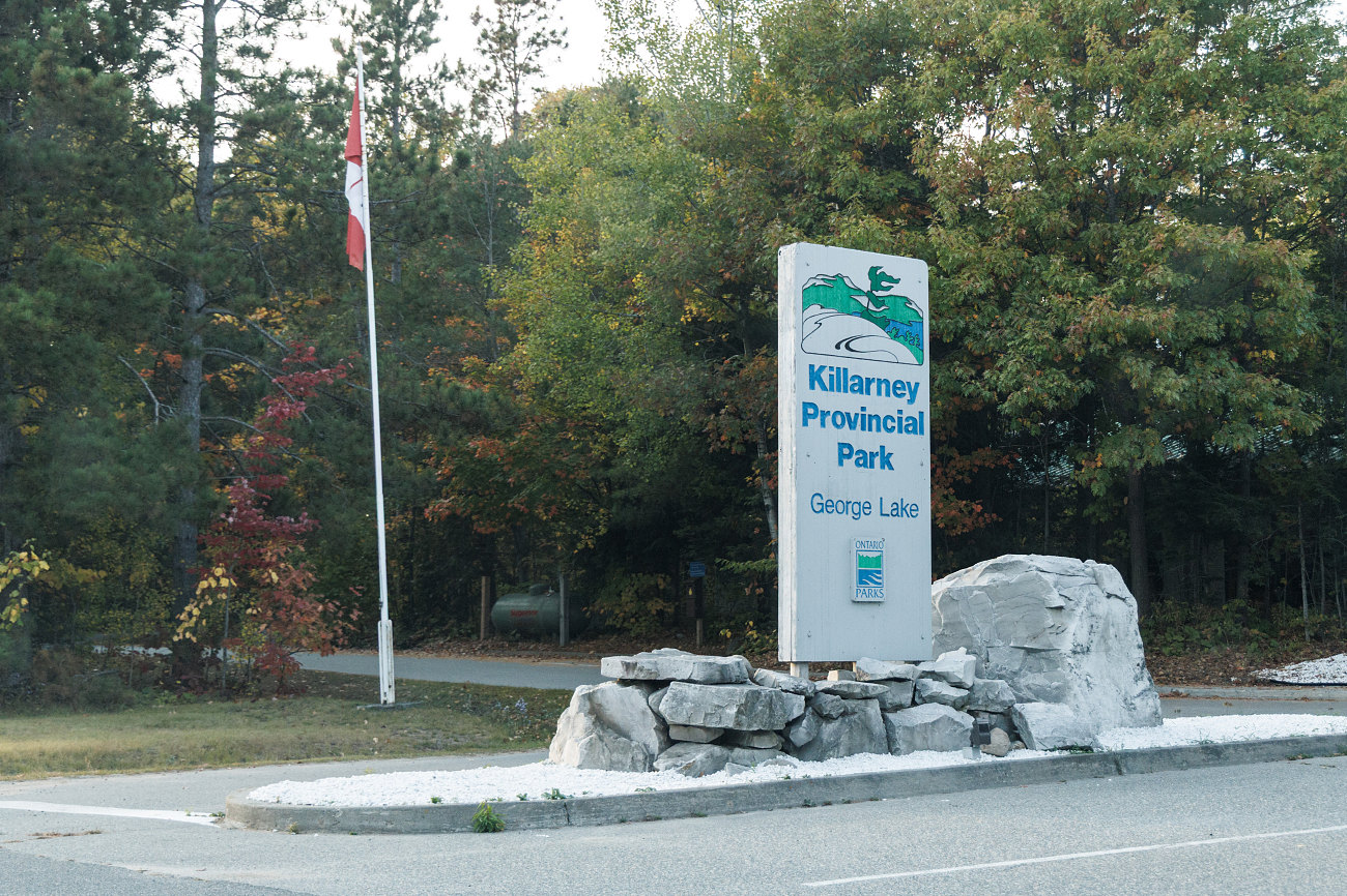 The entrance sign at Killarney Provincial Park's George Lake Campground Entrance. The office here doubles as the general headquarters of the park.