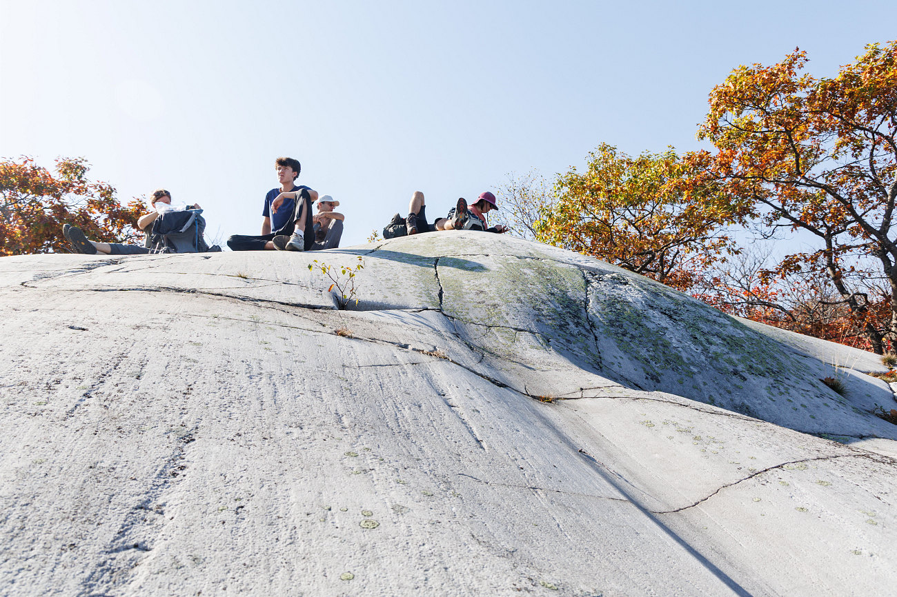 The low fall sun helps accentuate the highly glacially-striated quartzite bedrock of Silver Peak.