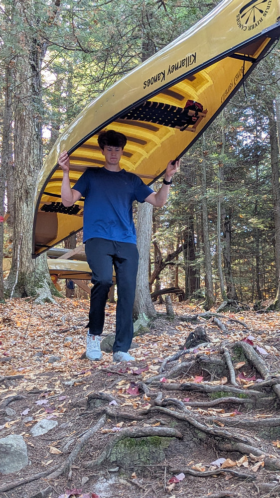 Rowan portages one of our rental canoes back down to the shore of Bell Lake, in preparation for our paddle back to the access point.