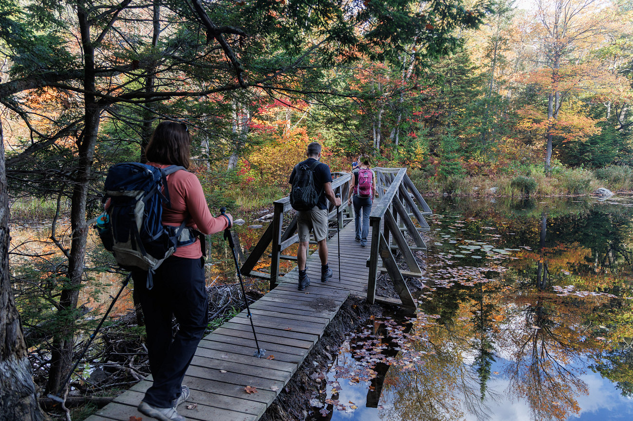 The trail crosses a sturdy wooden bridge across an arm of Kakakise Lake.