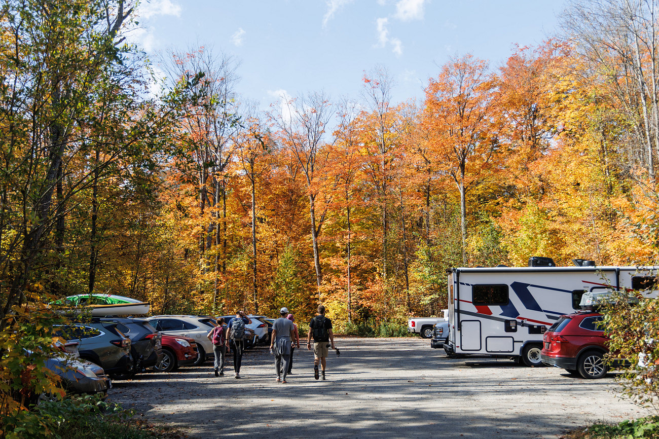 At noon on this fall Monday, the Crack Trailhead parking area is pretty much (but not totally) full.