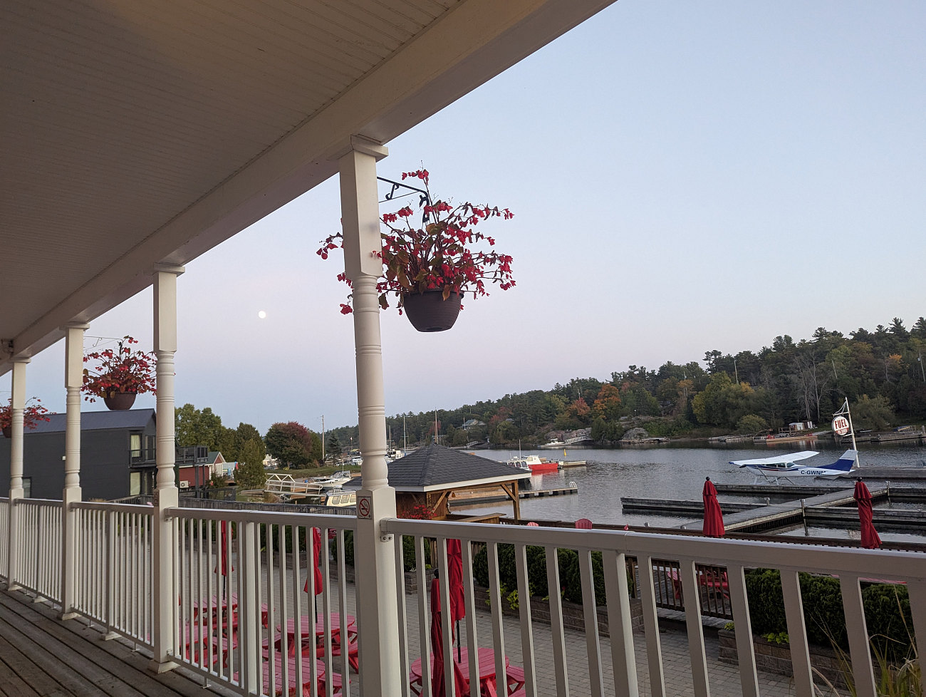 The view from the deck at the Sportsmans Inn and Marina in Killarney, Ontario. The nearly-full moon can be seen rising in the sky.
