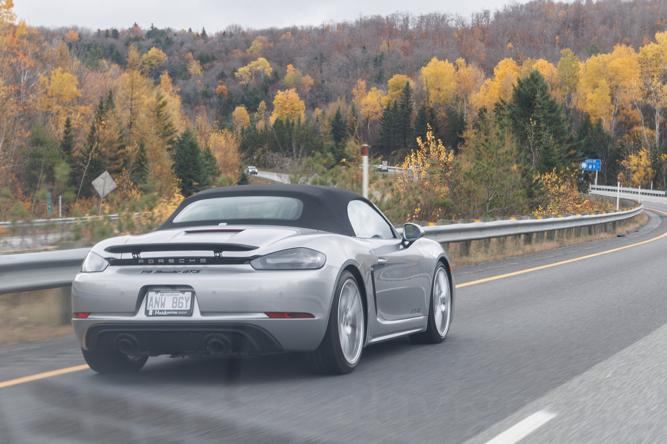 A shot of @BGTS2025's GT Silver Boxster GTS 3.0 cruising east on Quebec A-10. Note the extra-high configuration of his rear spoiler.