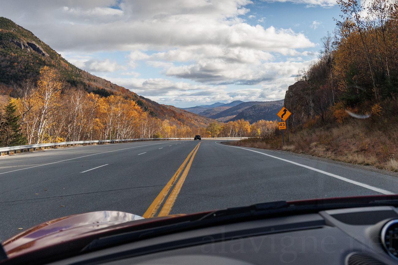Beautiful fall sunshine to the south Descending NH 16 from Pinkham Notch, towards North Conway. The weather to the south of the Presidential Range is beautiful - partly sunny, mild, and dry. And the fall colors around here are still pretty decent.