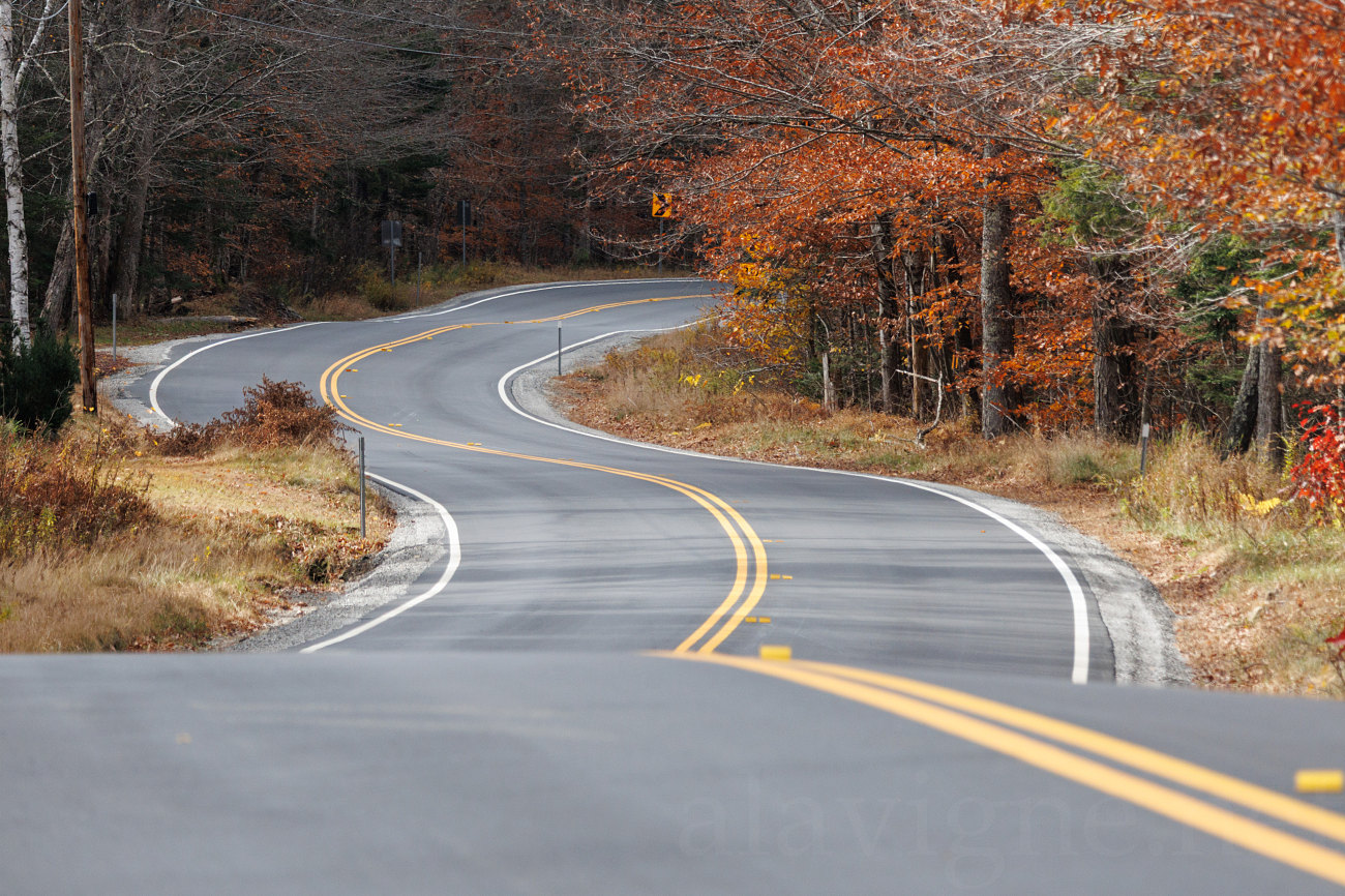 A shot of one of the many twists on the Sawyer Highway, located west of Lincoln, NH.   As of fall 2025, the highway is freshly-paved and perfectly-lined.   And it is quite a bit twistier than the nearby and much more famous Kancamagus Highway.