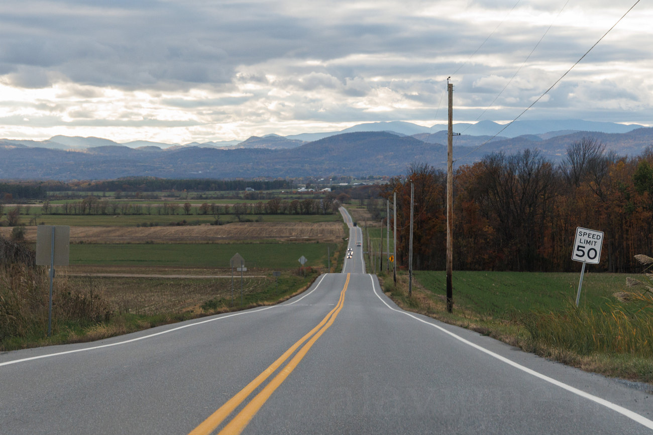After exhausting all of its curve allotment through Appalachian Gap, VT-17 becomes a mostly straight route, cutting west across the undulating farmland of western Vermont.   The mountains in the disance are the Adirondacks, in New York State.