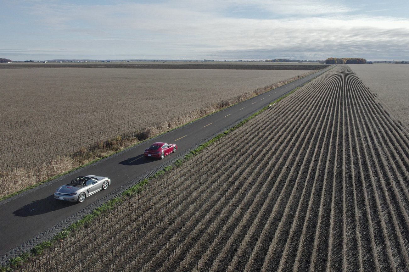A section of newly-paved backroad blacktop cuts across ruler flat farmland in extreme western Quebec, near the border with Ontario.