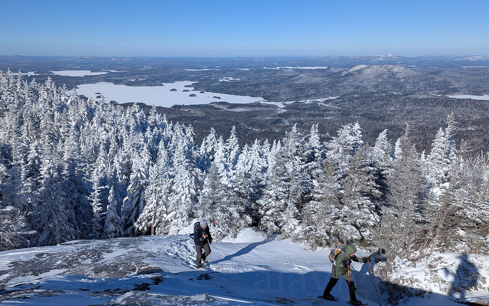 Climbing above the trees and into the beautiful open space at Ampersand's summit. A wide vista of the lake country to the west opens up to us.