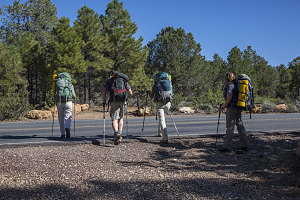 At 9:12 a.m., we headed off from our campsite, walking through the open pine forest of the Coconino Plateau, headed east. If Sandra and Alana did in fact arrive right on time, and if they did not experience any excessive traffic on Highway 64, they would arrive at the South Kaibab Trailhead around 10 a.m. We therefore had a bit of a brisk march ahead of us - a march fast enough to cover the approximately 3.5 kilometre walk from here to there in that time.