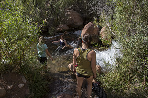 After establishing ourselves at our campsite, several of us took some time to head down to a little water hole along Bright Angel Creek, which ran by immediately to the west of the campground. Being served by both upstream springs and by runoff from high on the 8000+ foot Kaibab Plateau, the water was quite chilly, and it took a while before I could commit to fully immersing myself. I'm glad I did, though. Two and half days of salt, sweat and grime washed away by the creek's cold, clear waters (and for my clothes, too, which I soaked and wrung out in the creek).